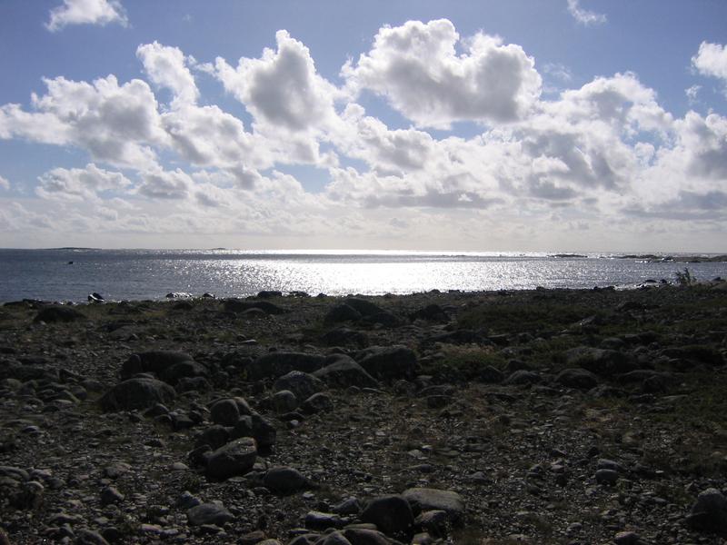 Stenig strand i motljus. (76/89)
